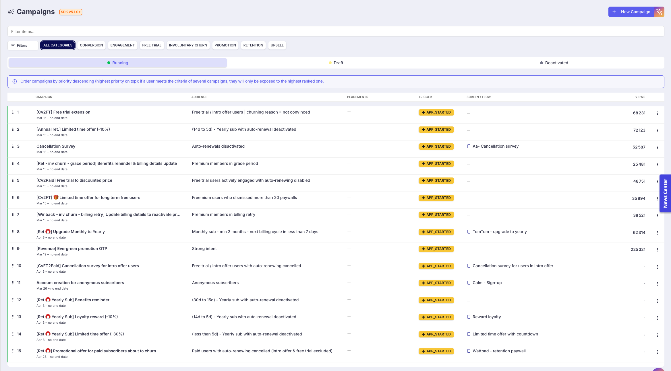 Active campaigns can be prioritized. This allows you to define which campaign a user should be exposed to when they are eligible for several campaigns at the same time.