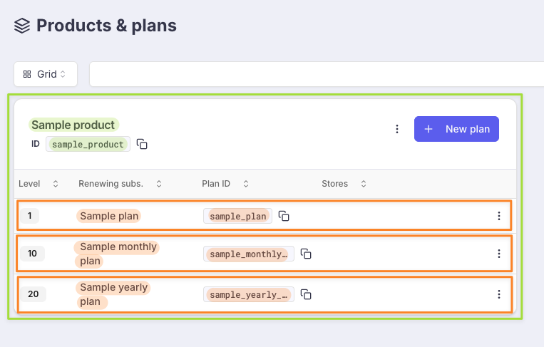 - a product (green in the screenshot) is the equivalent of an iOS "Subscription Group" or a Google "Subscription". In short, a user can only have 1 subscription at a time within the same product (which means if a user is already a subscriber to a monthly, and subscribed to a yearly in the same product, the monthly will be replaced with the yearly)
