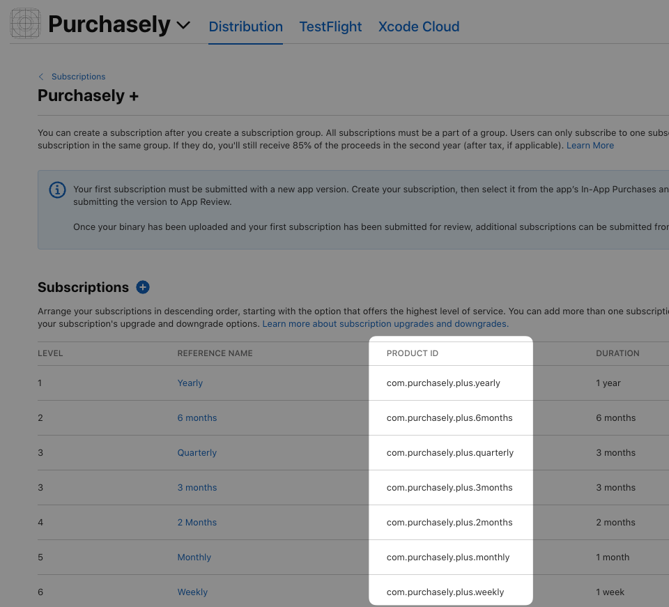 ID Apple: it corresponds to thePRODUCT IDcolumn in the App Store Connect (screenshot bellow shows subscriptions. You can use the samePRODUCT IDcolumn for In-App Purchases)
