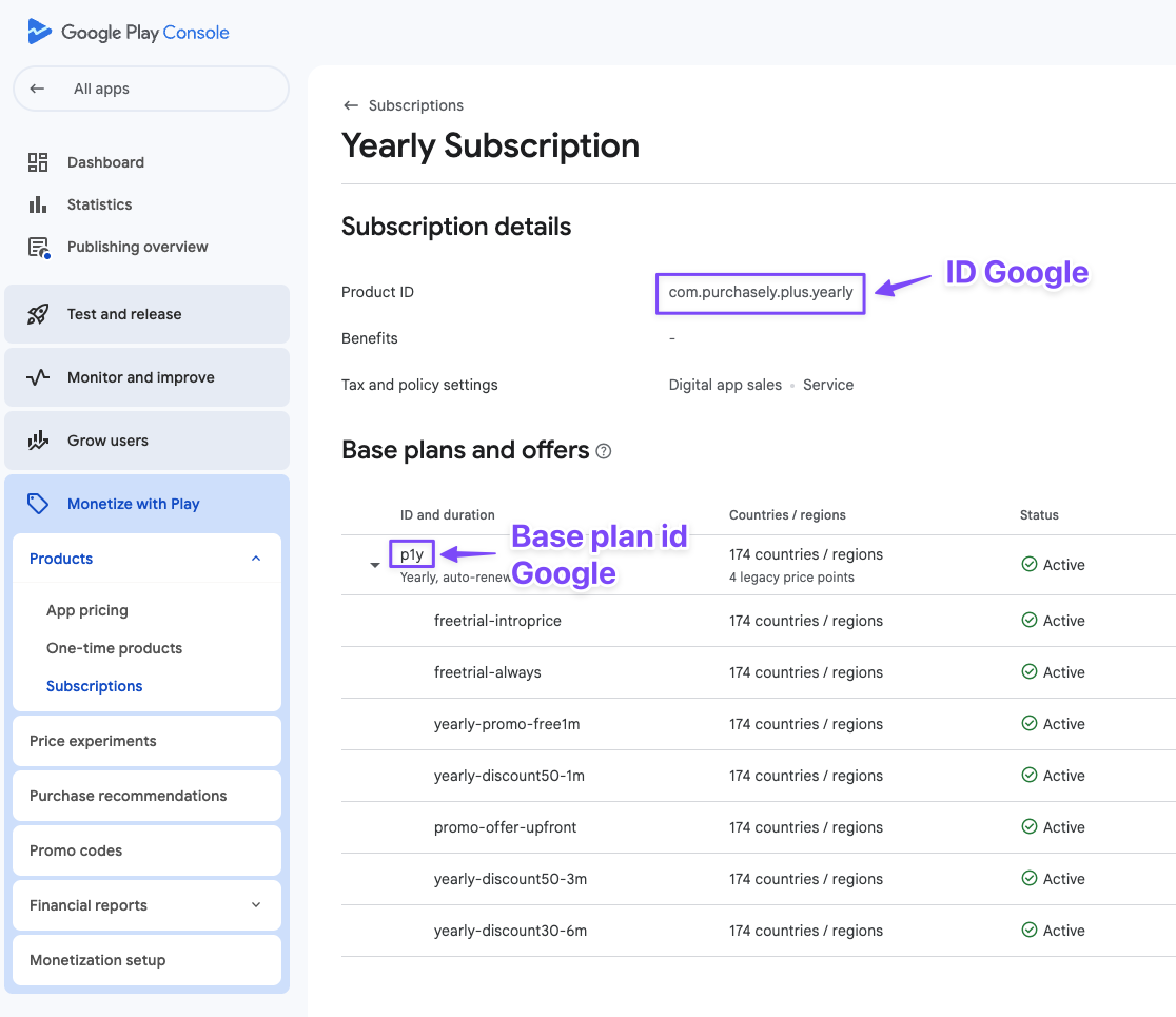 ID Google/Base plan id Google: present in the Google Play Console