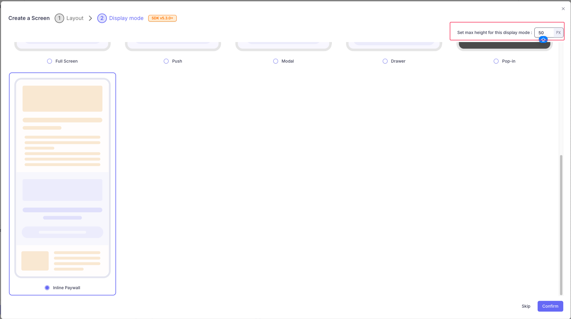 If no display mode has been configured, the default display mode is applied by the SDK is Modal. The default display mode will also be applied by versions of the SDK inferior to 5.3
