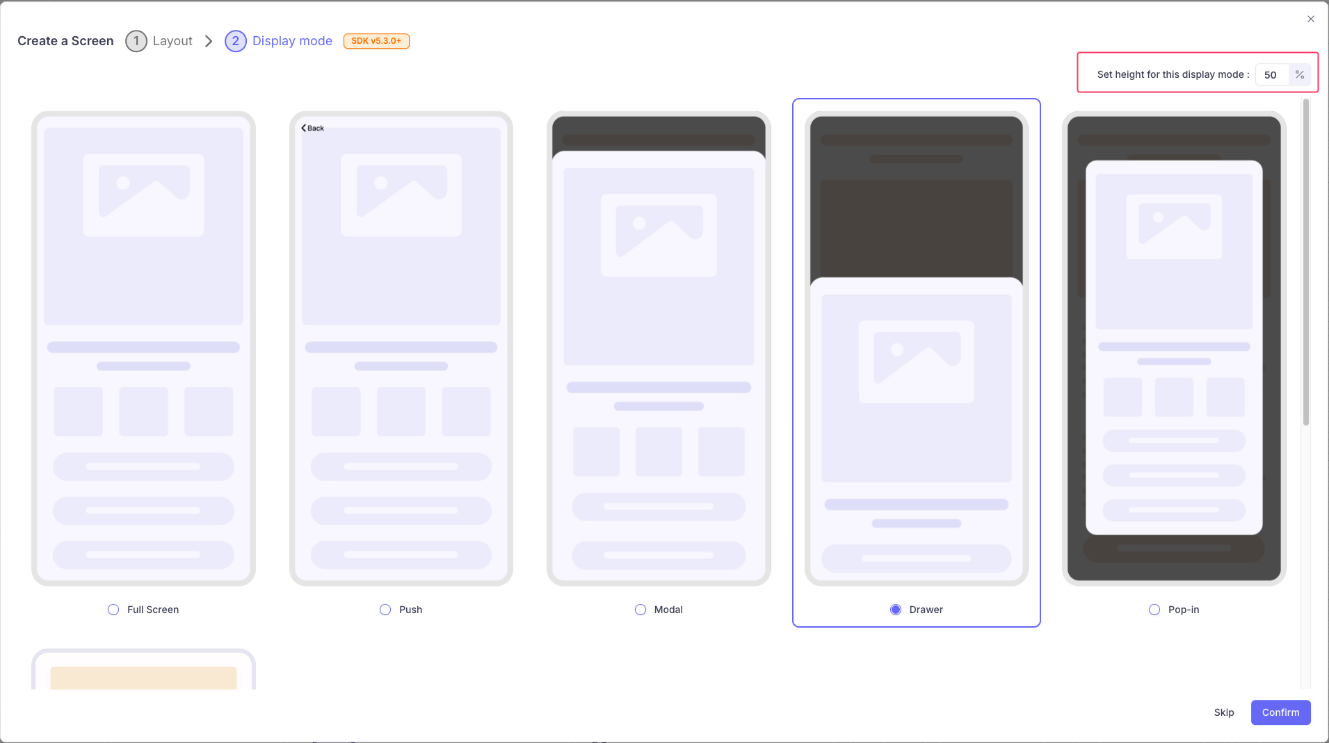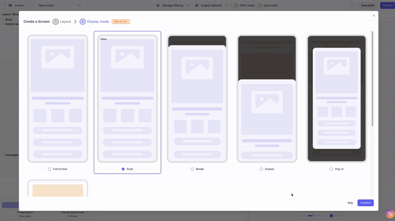 You can set the display mode when creating a new screen. After clicking “New screen”, you’ll see options to choose both the screen Layout and the Display mode.