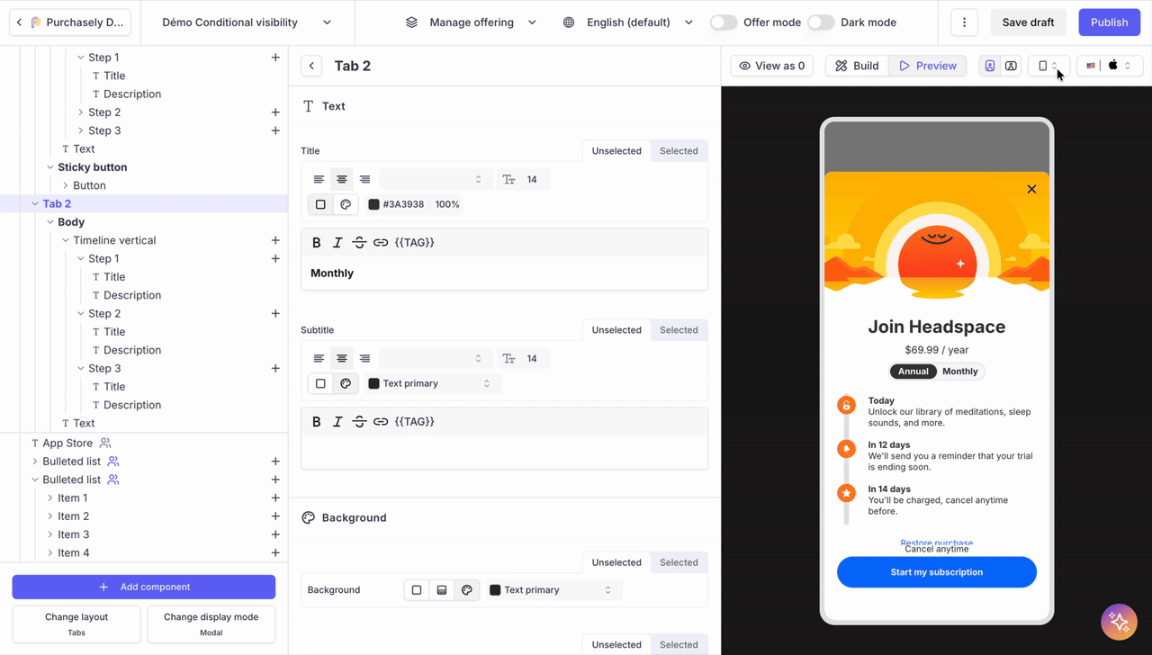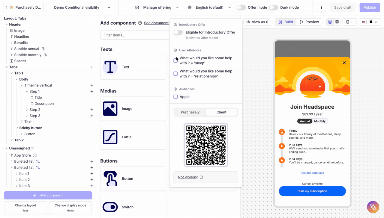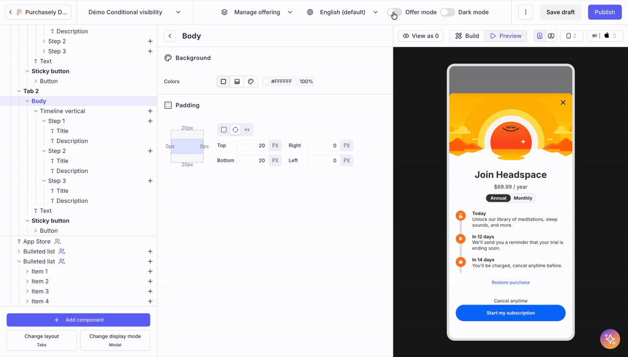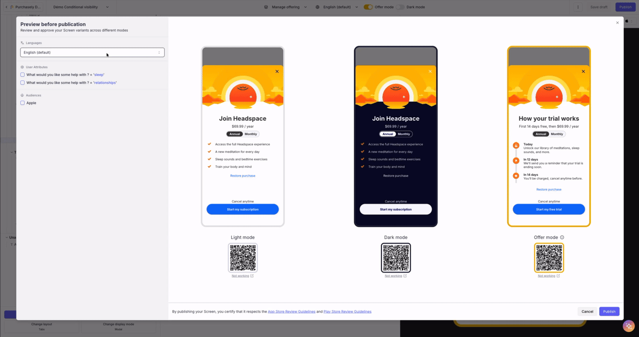 The Preview feature lets you validate how a Screen will look and behave before exposing it to end users. Purchasely provides two complementary preview mechanisms: