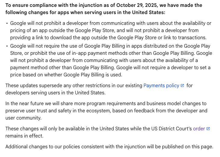 On October 29th 2025, Google has also updated their Google Play's policies for developers serving users in the US to ensured compliance with the injunction: